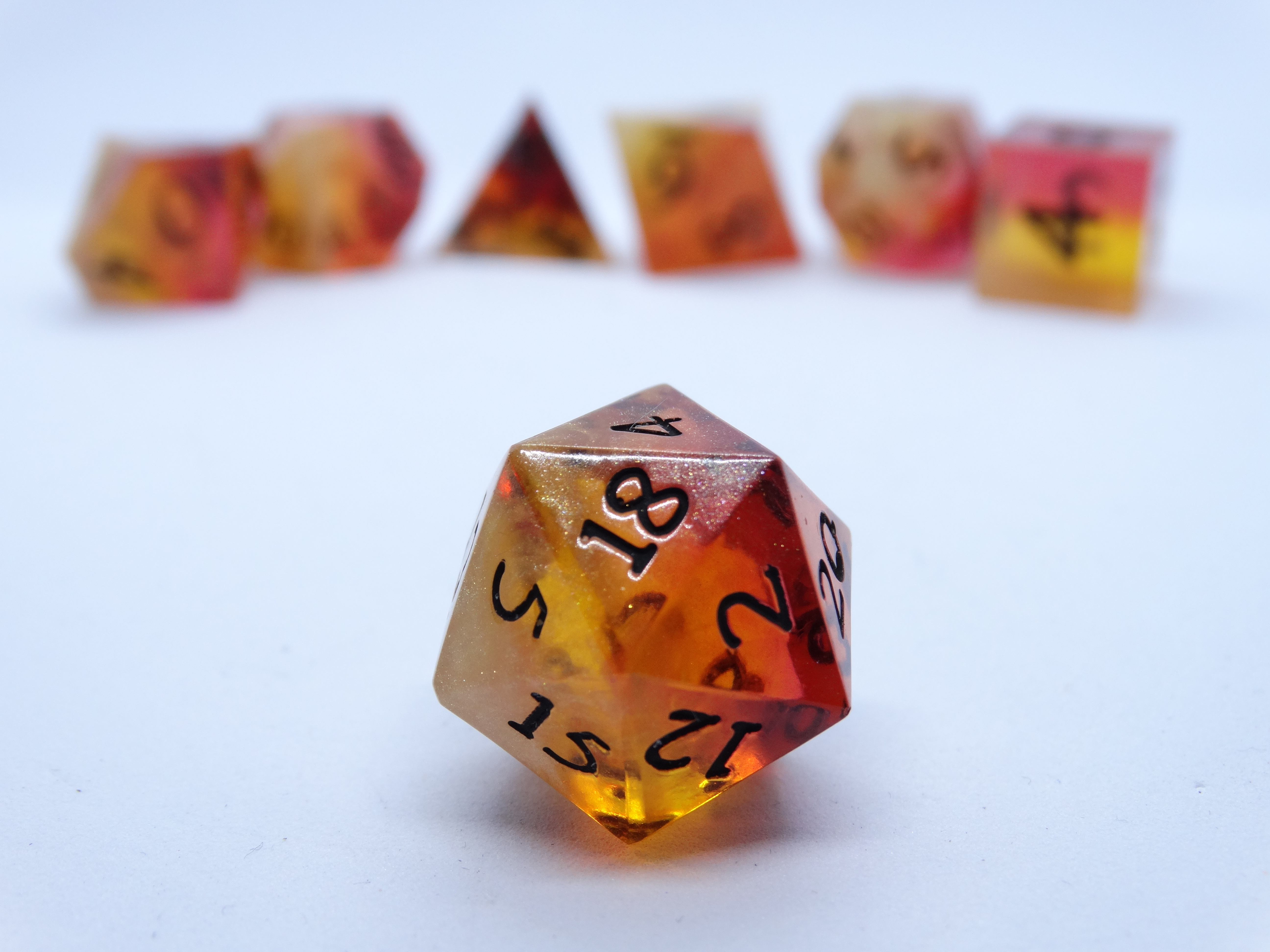 Ciò che propongo spazia dai set completi (principalmente usati per dungeons and dragons, quindi 7 dadi: d4, d6, d8, d10, d100, d12, d20) a dadi singoli, a gioielli come collane, orecchini, bracciali e portachiavi. Tuttavia, ho tante altre idee in serbo, che non vedo l’ora di realizzare.