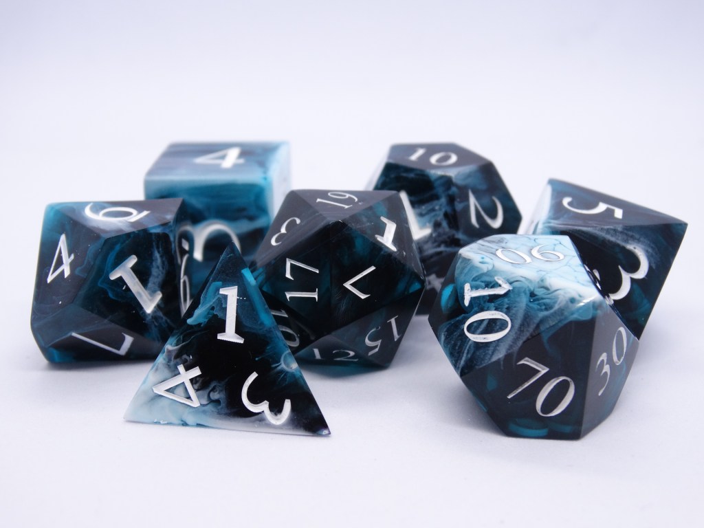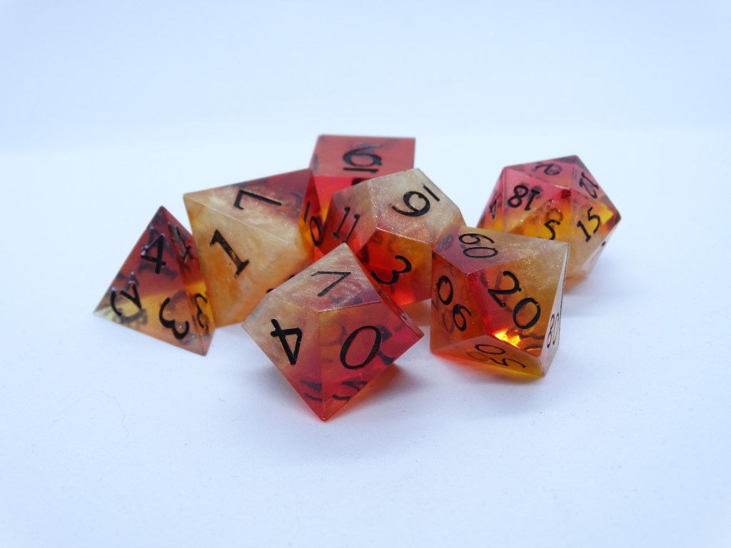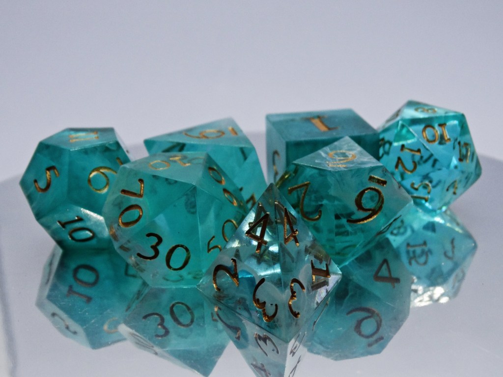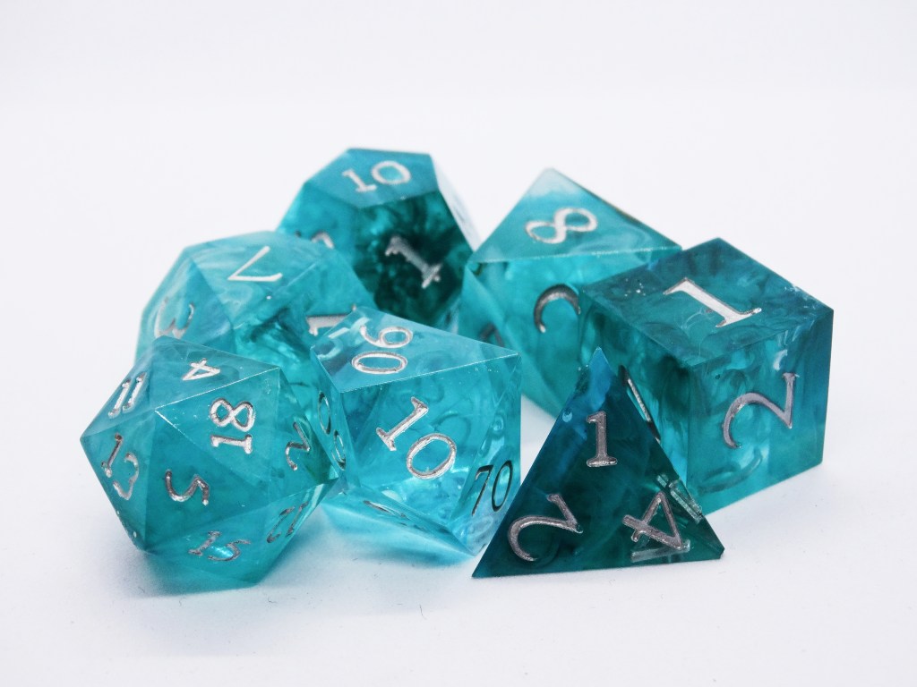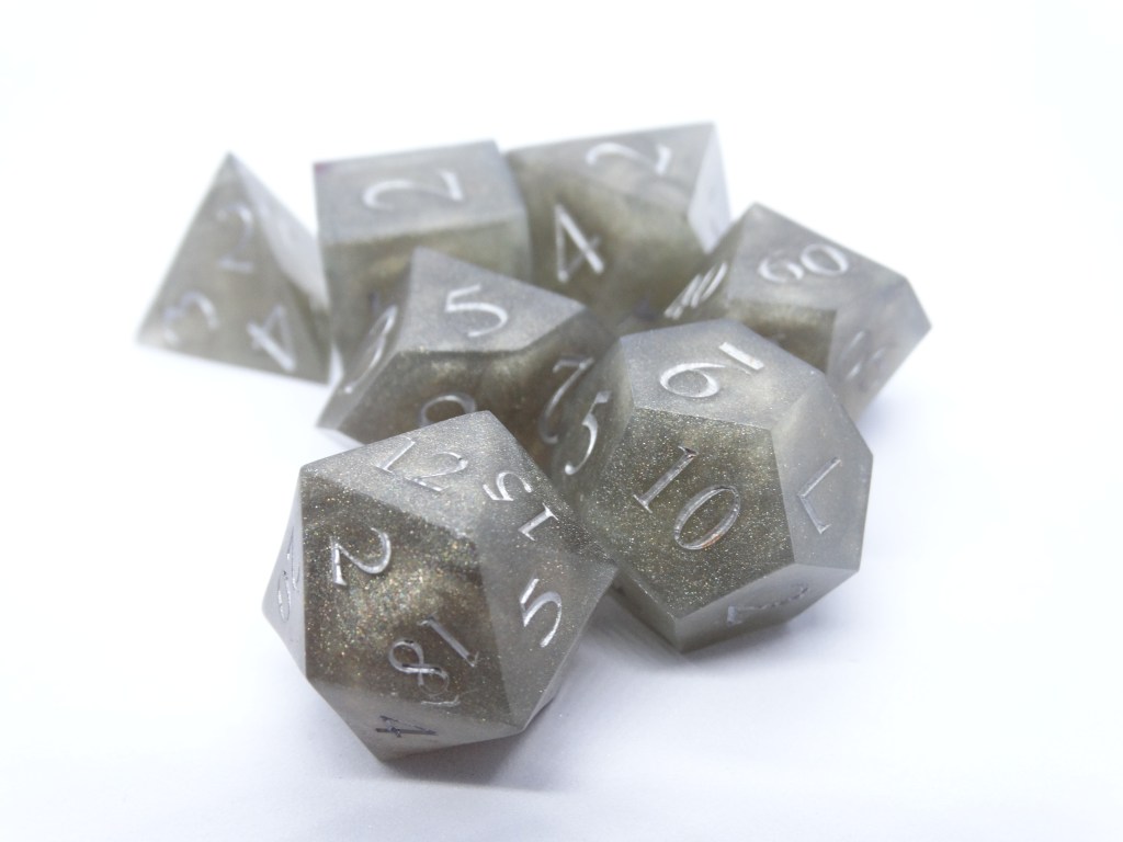 Questi sono dadi fatti in resina epossidica. Gli spigoli sono ben definiti e appuntiti e fanno parte della linea sharp. In commercio si possono trovare anche dadi dagli spigoli arrotondati, più fruibili da un pubblico più piccolo.