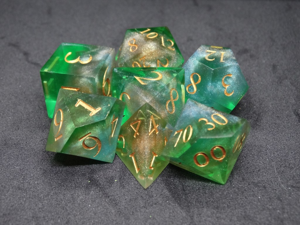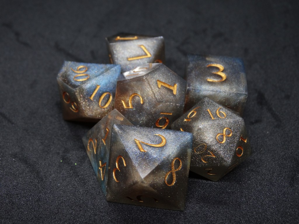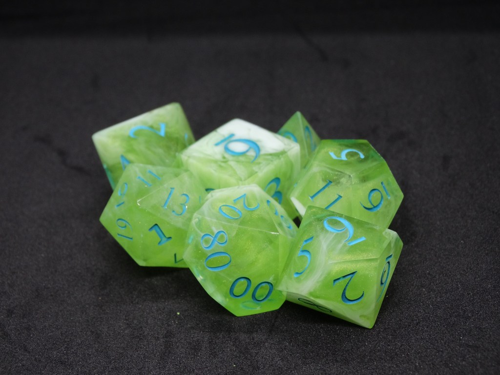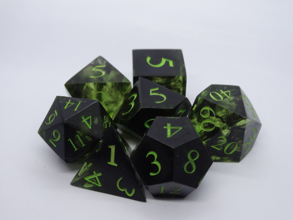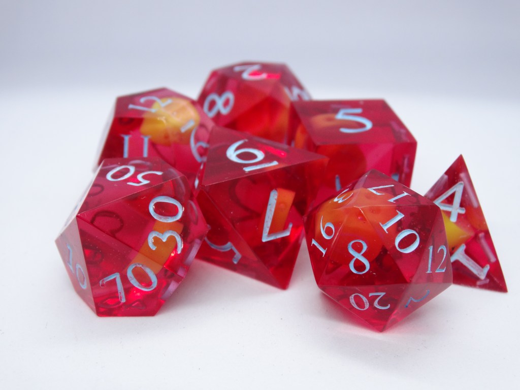 Questi sono dadi fatti in resina epossidica. Gli spigoli sono ben definiti e appuntiti e fanno parte della linea sharp. In commercio si possono trovare anche dadi dagli spigoli arrotondati, più fruibili da un pubblico più piccolo.